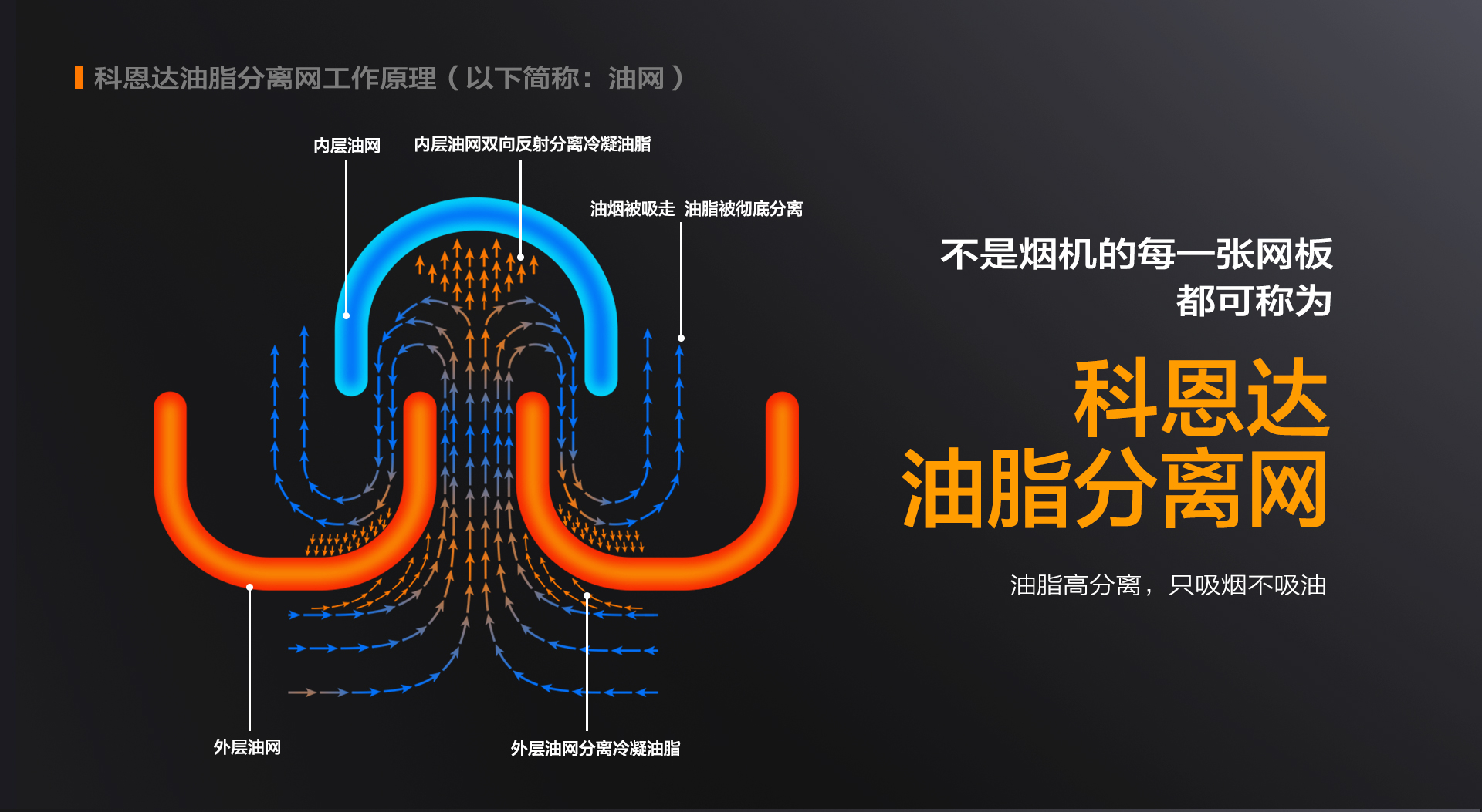2. 在應(yīng)用“科恩達(dá)平網(wǎng)”的情況下,油煙在升騰、炸開、擴(kuò)散的過程中與單組的進(jìn)氣口和出氣口在同一軸線上,油煙分子被有序迅速吸走。