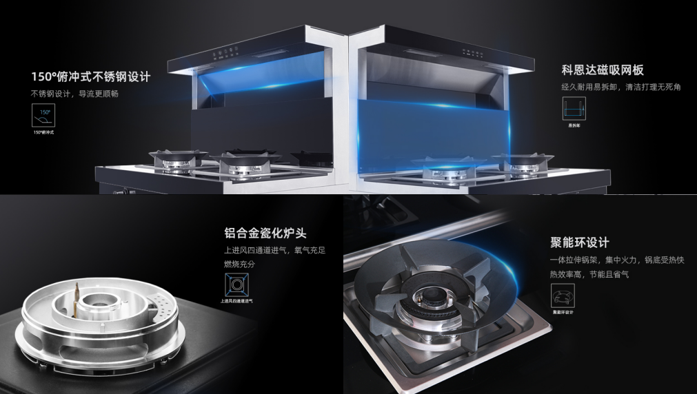 150°俯沖式不銹鋼設(shè)計,導(dǎo)流更輕松,排煙更順暢,科恩達磁吸網(wǎng)板,耐用易拆卸,清潔打理360°無死角,鋁合金磁化爐頭+一體拉伸聚能環(huán)設(shè)計,受熱更均勻,氧氣更充足,燃燒更充分。