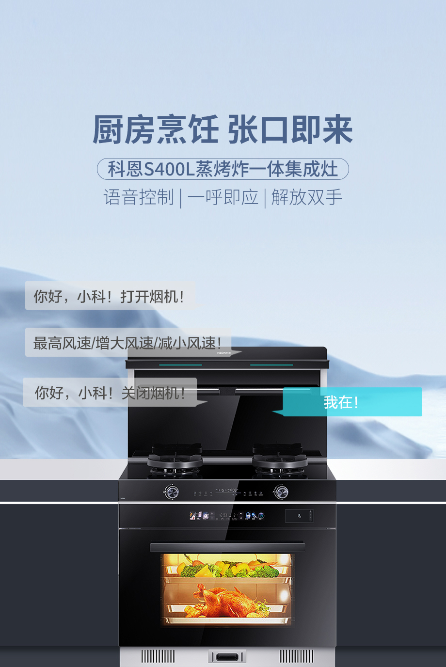 廚房烹飪,張口即來(lái)!一句“你好小科”,開(kāi)啟一天烹飪生活!S400L內(nèi)置語(yǔ)音控制一呼即應(yīng),真正解放雙手。
