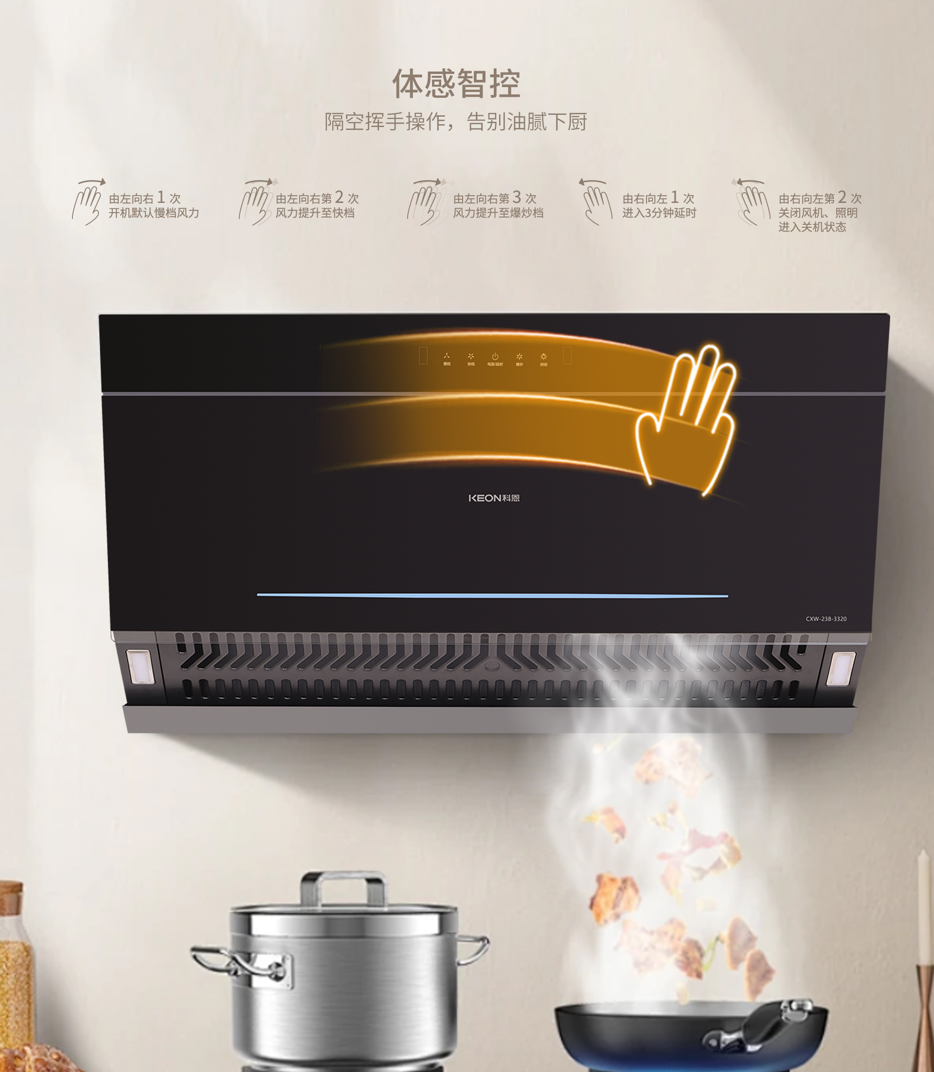 操作上的便捷性同樣不可或缺。“隔空揮手操作”讓使用者告別油膩下廚,無(wú)需觸碰煙機(jī),通過(guò)揮手就能輕松控制開(kāi)關(guān)、調(diào)節(jié)風(fēng)速等功能,盡顯科技魅力。“一線天星空藍(lán)氛圍燈設(shè)計(jì)”為廚房增添時(shí)尚大氣之感,科技感十足。特氟龍工藝機(jī)身與易潔鋼化玻璃的組合,使得煙機(jī)清理變得輕而易舉,煙機(jī)清理從此不求人。