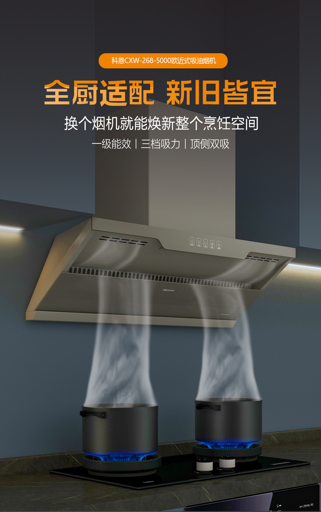 嵌入美學(xué),颶風(fēng)凈界??贫鳉W近式吸油煙機(jī)5000,275mm纖薄機(jī)身平行嵌入櫥柜。太空灰如暮色浸染,適配任意風(fēng)格,敞開式攏煙區(qū)擴(kuò)大50%,科恩爆炒時(shí)颶風(fēng)瞬吸,辣味未散油煙已凈。舊廚房的逆襲法則,獨(dú)立安裝不挑戶型,嵌入即高級(jí)。IP67級(jí)LED冷光燈穿透蒸汽迷霧;兩檔吸力+爆炒模式;3分鐘延時(shí)凈煙,余味消散無蹤;老破小廚房秒變開放式料理廳。