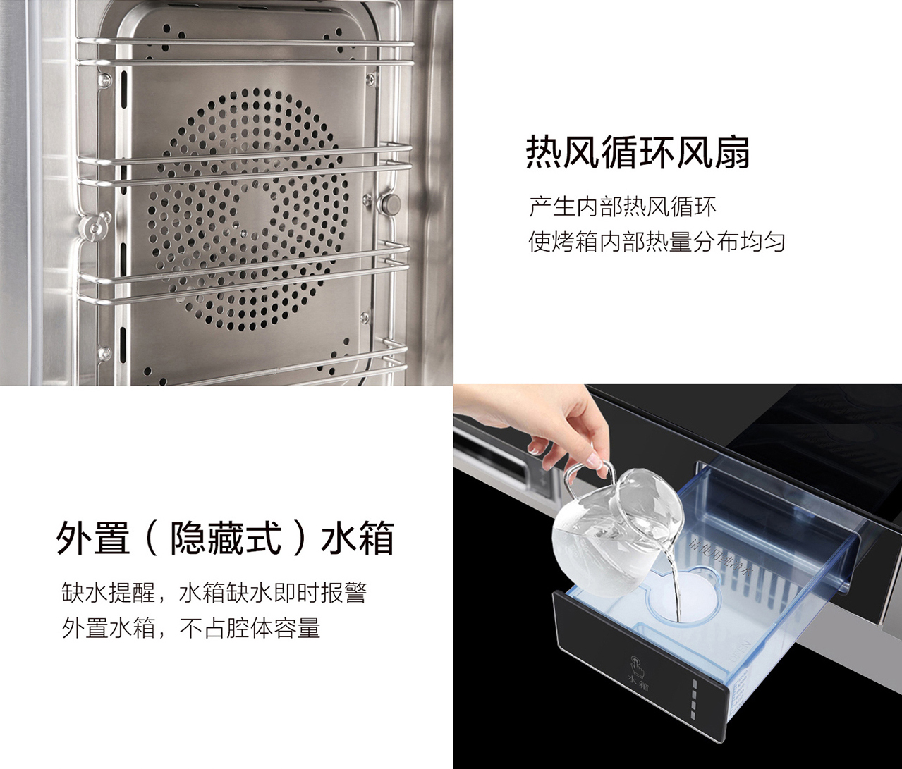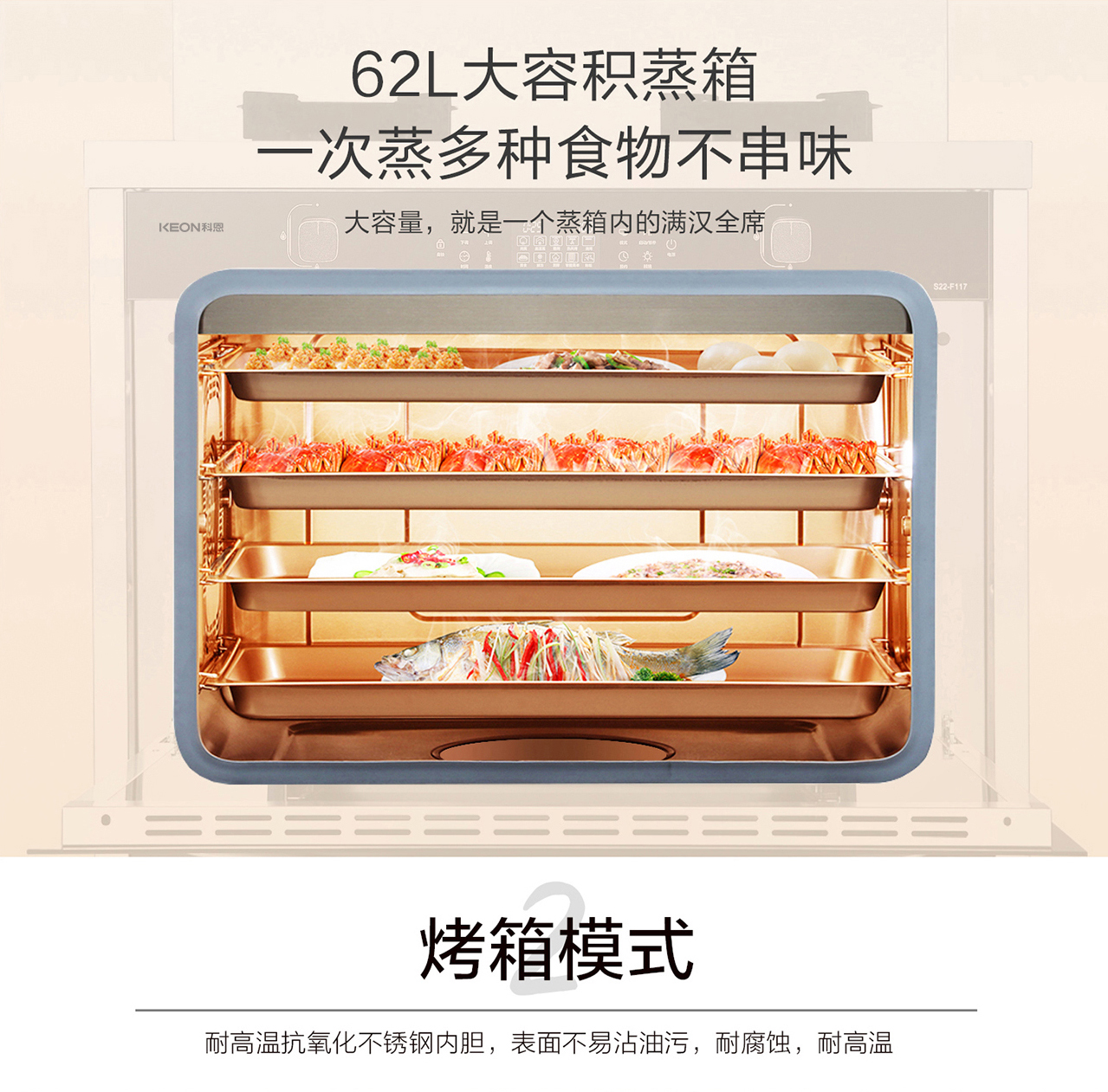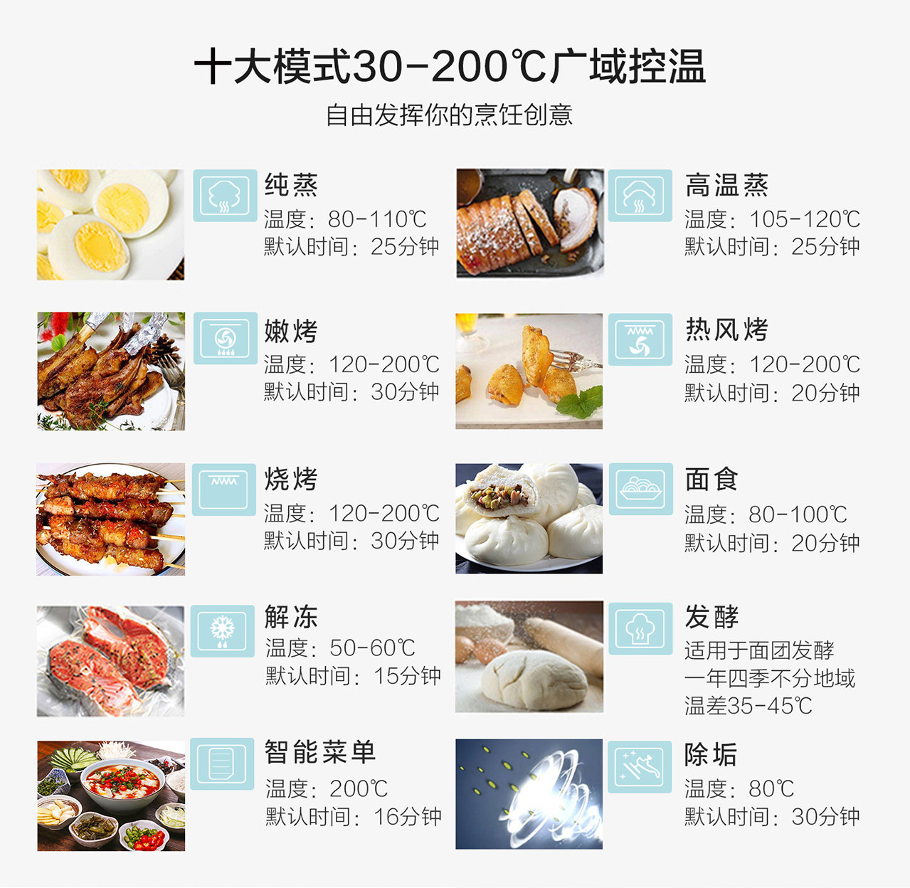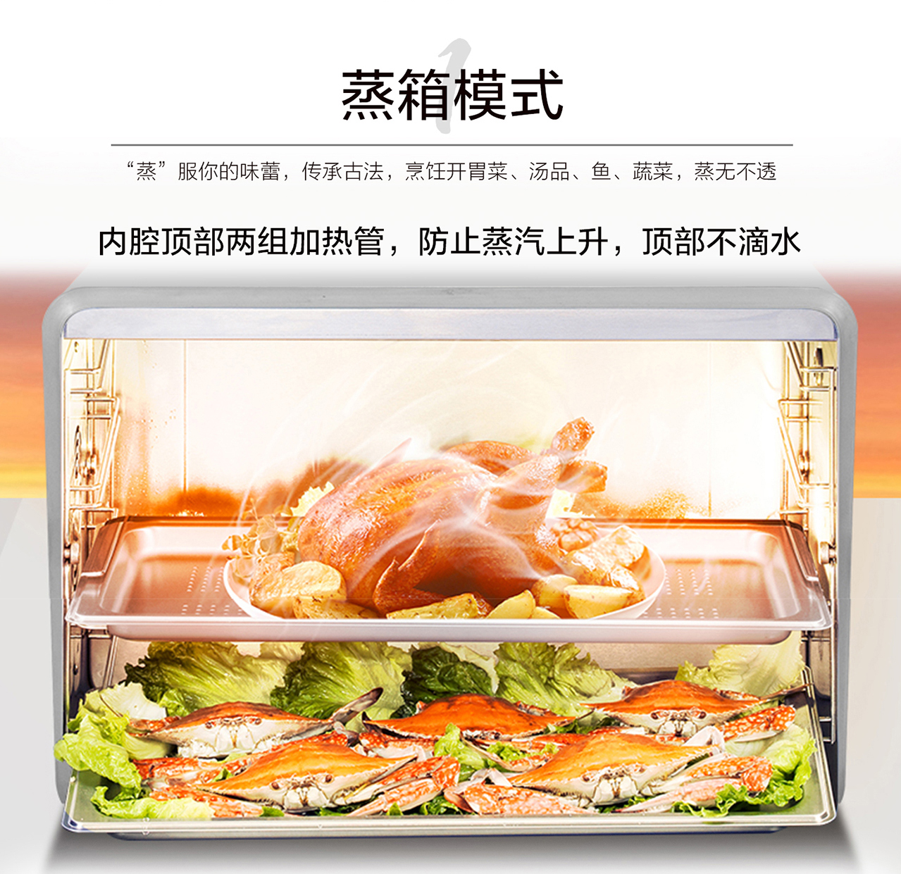 62L大容量食品級304不銹鋼內(nèi)膽,上下4層設計,9種蒸烤模式。