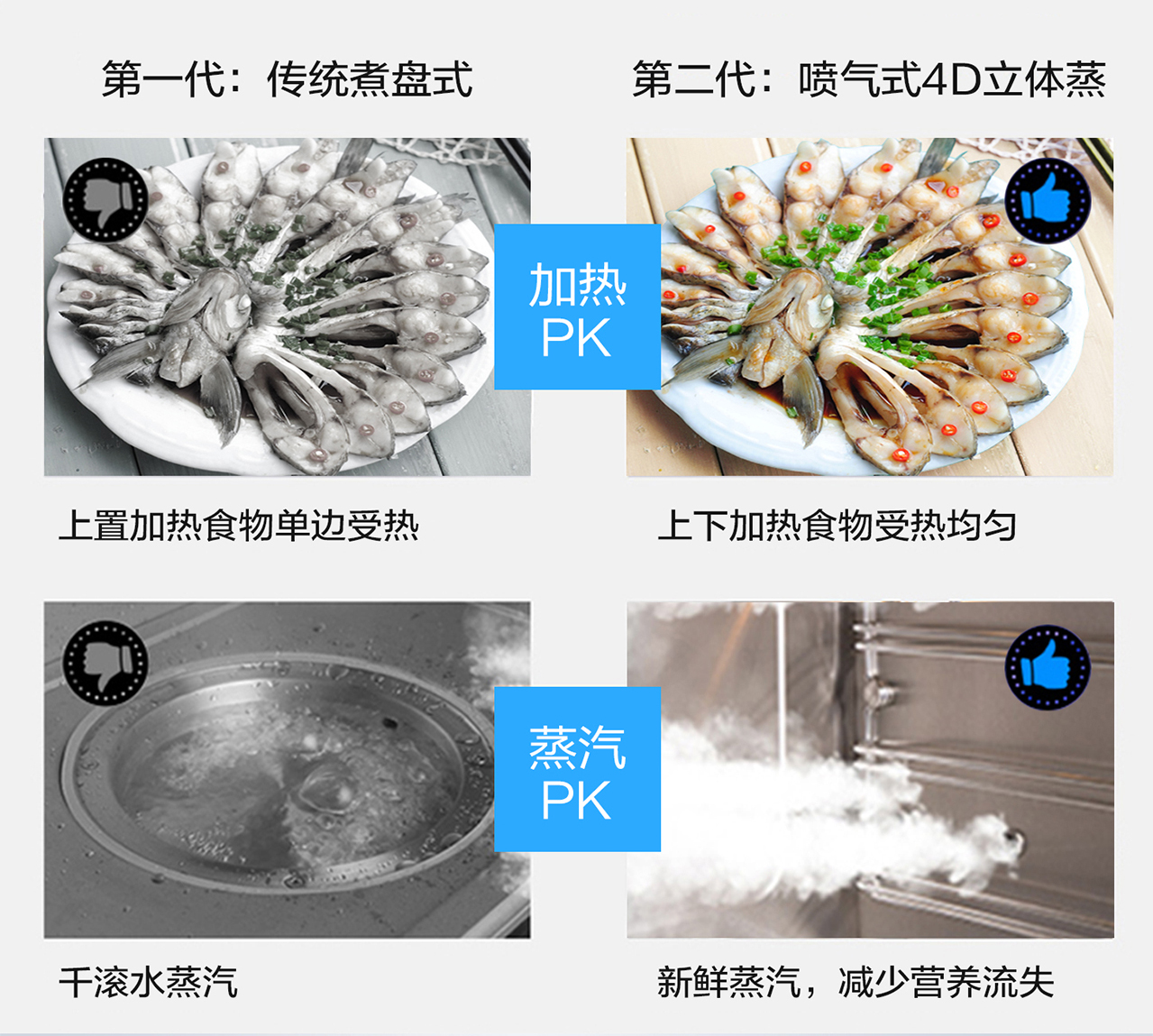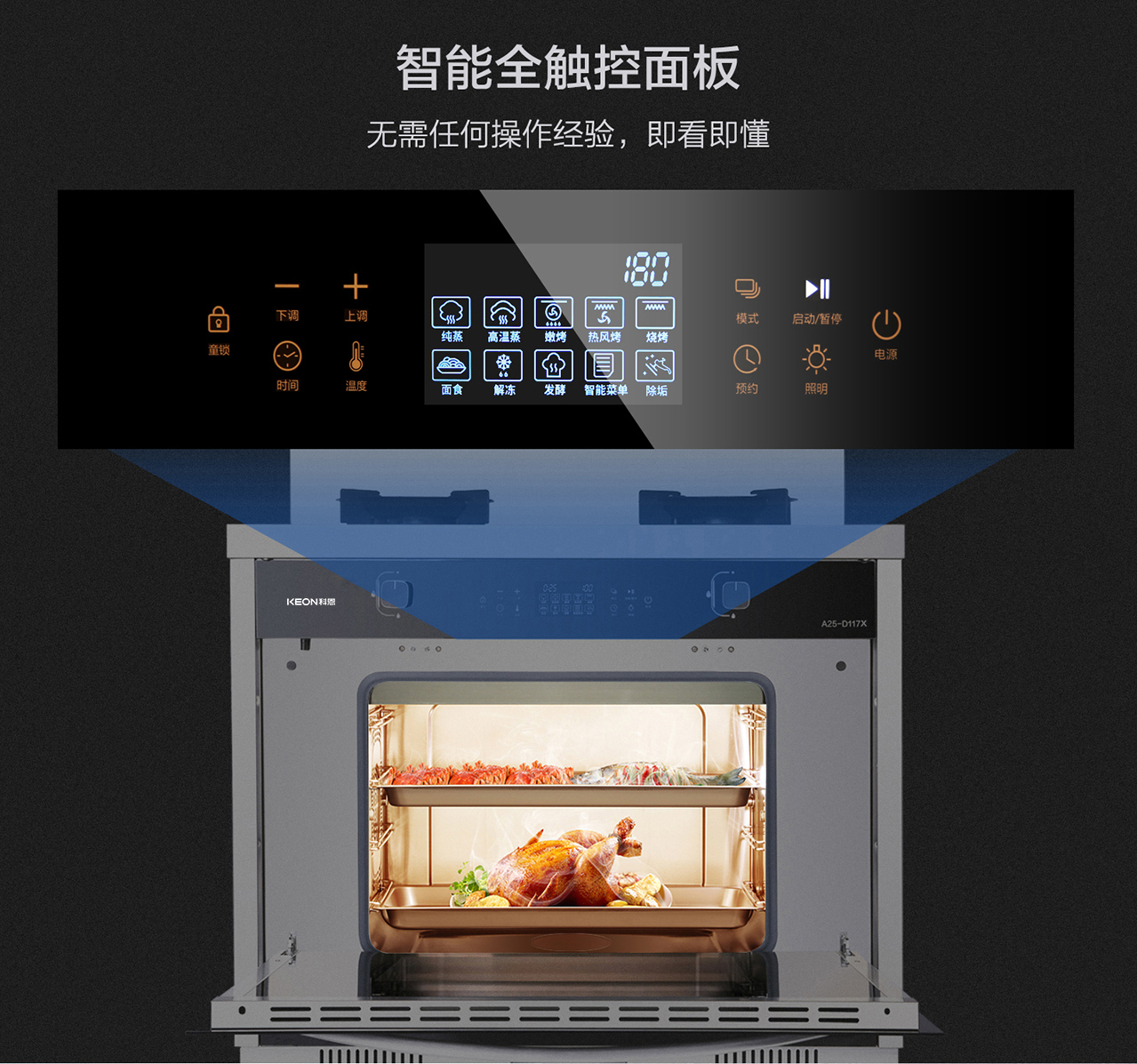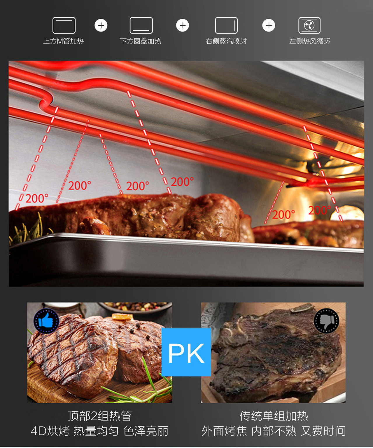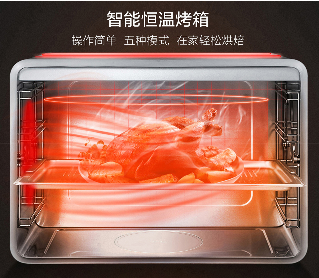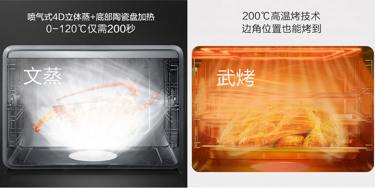 62L大容量食品級304不銹鋼內(nèi)膽,上下4層設計,9種蒸烤模式。