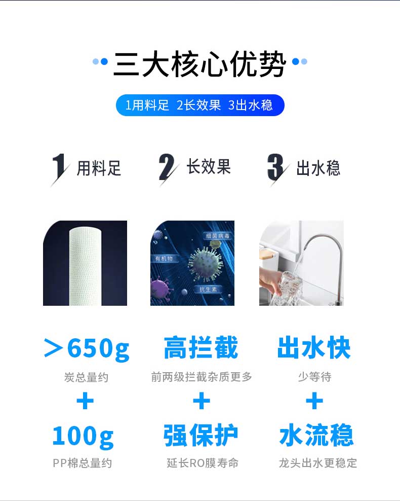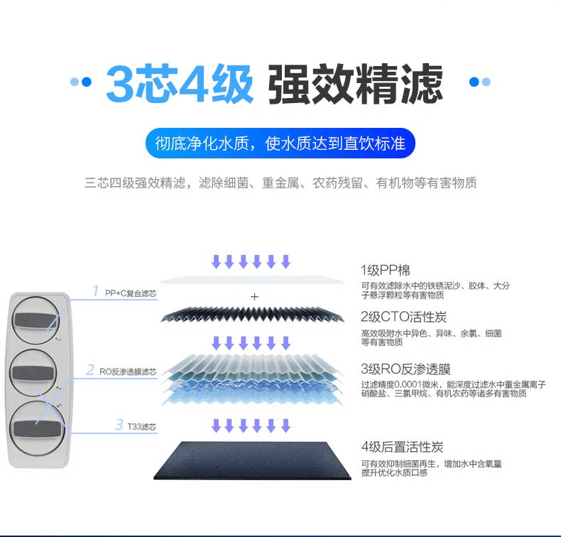 - 三芯四級強(qiáng)效精濾,濾除99%細(xì)菌重金屬
