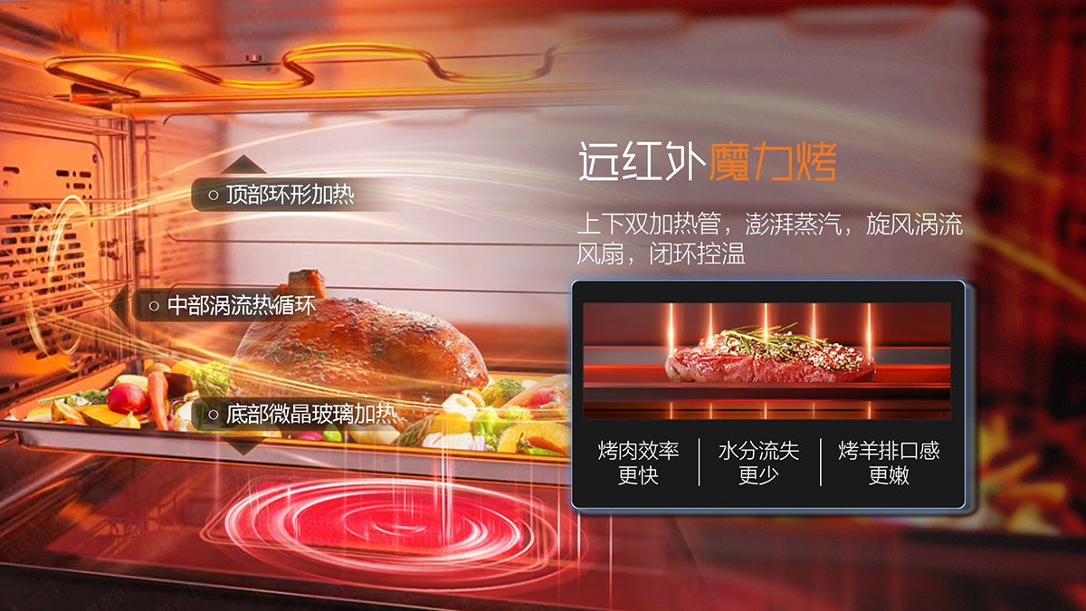 - 遠(yuǎn)紅外魔力蒸,底盤進(jìn)階速蒸,360°蒸汽循環(huán),3秒出蒸汽,鎖鮮食材
