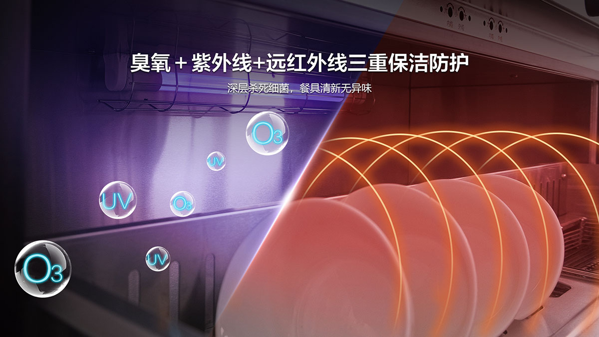 臭氧+紫外線+遠(yuǎn)紅外線三重保潔防護(hù),深層殺菌