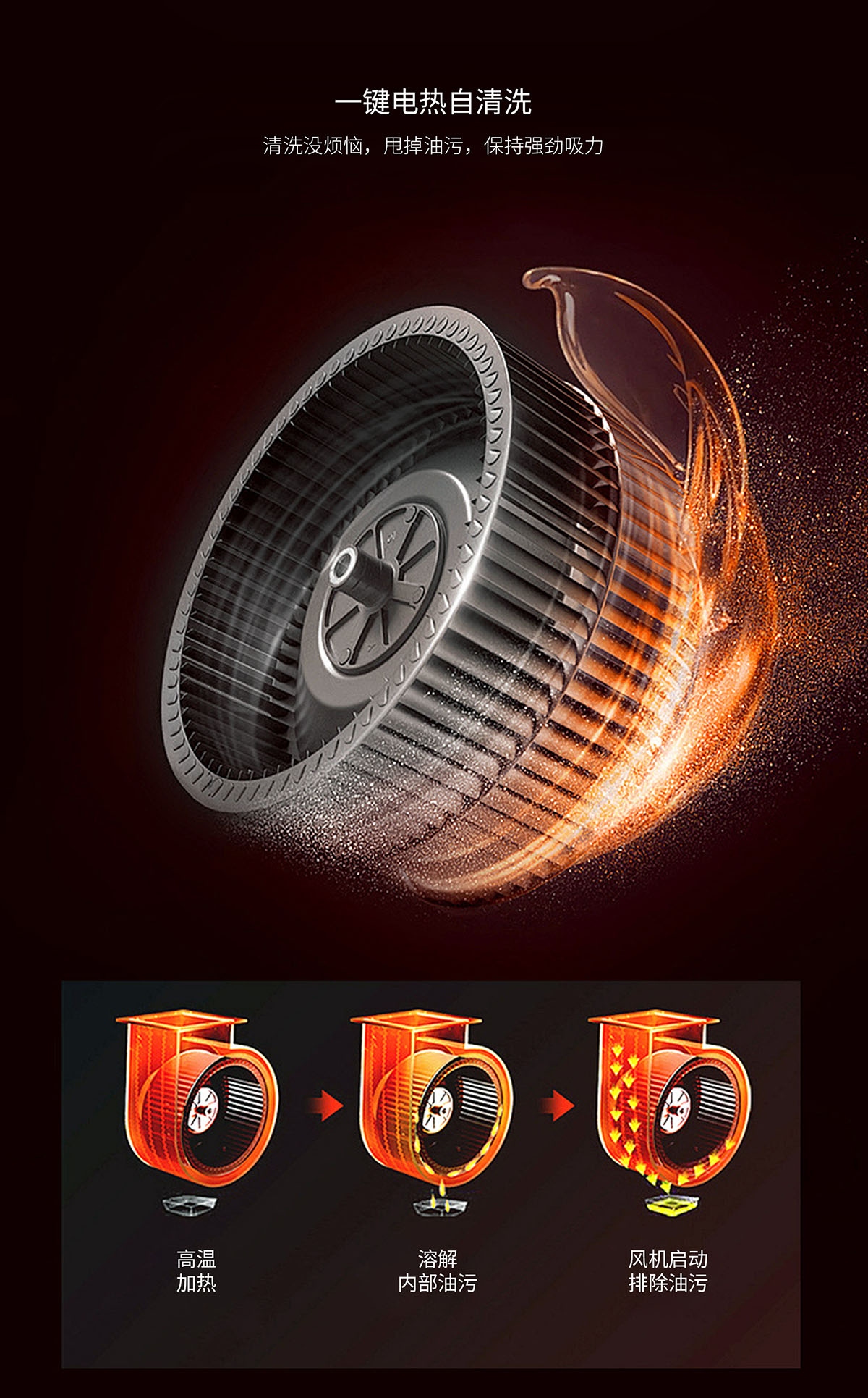 電熱自清洗,甩掉油污,保持強(qiáng)勁吸力